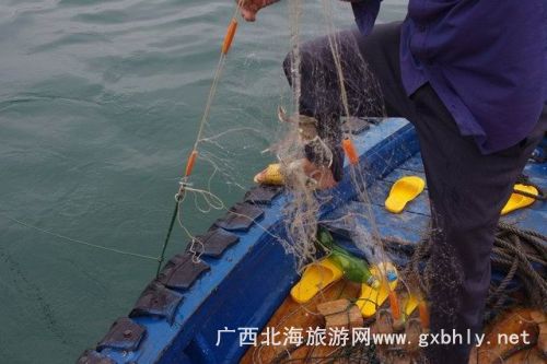 在等著魚兒撞網(wǎng)的一個小時里,我們在大叔的指導(dǎo)下開始了釣魚。先是用小刀將提前準(zhǔn)備好的魷魚,切成小塊當(dāng)誘餌,我們的釣魚工具很特殊,一個罐瓶子卷著釣線,漁夫告訴我們,在深海釣魚用這種辦法比較好釣,又很有手感,當(dāng)?shù)氐臐O民出海釣魚都是這樣釣的。就這樣,我們的帥哥美女們就開始認(rèn)真的釣了起來,因為比較生疏,就漁夫釣了幾條石頭魚。