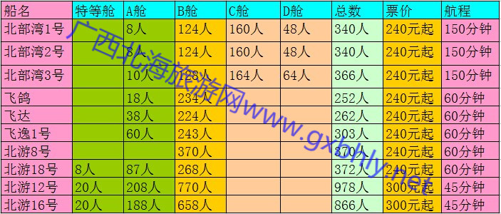 “北游8號”(快船)總長38.2米,船寬10.2米,總噸位為460噸,載客定位為372個客位,抗風(fēng)能力為6級。航速為20節(jié),75分鐘就可以到達(dá)潿洲島。