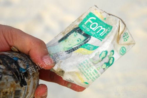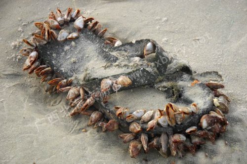 隨椰子一同沖上來的還有一些生活垃圾,如廢棄的飲料瓶、果凍包裝、涼鞋等物品。這些東西無一例外上面長(zhǎng)滿了牡蠣,似在海底沉了不短的時(shí)間。生活垃圾上寫的文字不是中文看不懂。