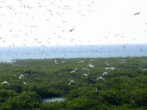 金海灣紅樹林景區(qū)內(nèi)看到成群的白鷺棲息在紅樹林上,足有幾百只,數(shù)量相比往年增加了不少。每當(dāng)漲潮時,白鷺群中有的站在枝頭,有的在林中跳躍、有的低空飛翔,溫和宜人的氣候讓白鷺群自由自在地在紅樹林間棲息、覓食。