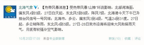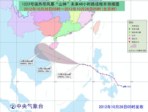 受“山神”和冷空氣的共同影響,26日08時至27日08時,我國黃巖島附近海域、三沙市及其附近海域以及南海中部海域?qū)⒂?-9級大風(fēng),陣風(fēng)可達10-11級,“山神”中心經(jīng)過的附近海域的風(fēng)力有10-11級,陣風(fēng)可達12-13級;巴士海峽、巴林塘海峽、南海北部和南部海域、瓊州海峽、北部灣以及廣東沿海、海南沿海也將有6-7級大風(fēng),部分海域或地區(qū)陣風(fēng)可達8-9級;黃巖島及三沙市附近海域、海南島東部將有大到暴雨。