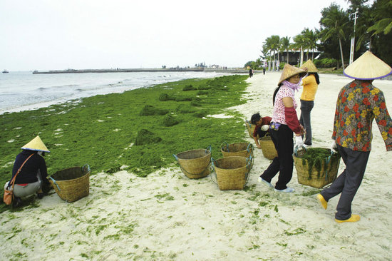 據(jù)報道,近日,銀灘公園遭受海藻侵襲,大面積沙灘被海藻覆蓋。北海銀灘景區(qū)組織環(huán)衛(wèi)員工全力以赴投入到清理海藻的工作中。但是,由于海藻覆蓋面太大,清理工作異常艱難。截至16日,銀灘景區(qū)共清理海藻近100噸。
