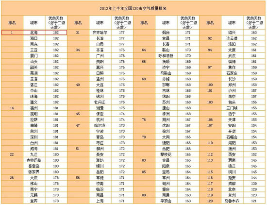 2012年全國(guó)空氣質(zhì)量榜 北海榮登第一