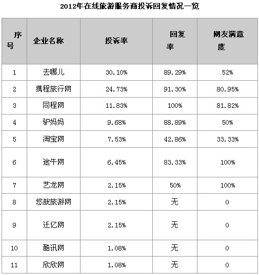 人民網(wǎng)北京3月15日電 ,根據(jù)人民網(wǎng)旅游3·15投訴平臺(tái)的數(shù)據(jù),對(duì)2012年在線旅游服務(wù)商投訴回復(fù)情況進(jìn)行了統(tǒng)計(jì),其中投訴比例最高的為去哪兒網(wǎng),達(dá)到30.1%,緊跟其后的是攜程旅行網(wǎng),達(dá)到24.73%,同程網(wǎng)排名第三,達(dá)到11.83%,成為在線旅游服務(wù)商投訴最多的前三名。此外,根據(jù)排行榜中的數(shù)據(jù)顯示,同程網(wǎng)和攜程旅行網(wǎng)的投訴回復(fù)率較高,而同程網(wǎng)回復(fù)率達(dá)100%。