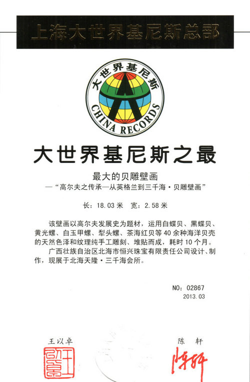 據(jù)報道,近日,由北海市恒興珠寶有限責任公司設計、制作的“高爾夫之傳承—從英格蘭到三千海·貝雕壁畫”申報“大世界基尼斯之最(中國之最)”獲得上海大世界基尼斯總部確認。