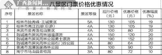 據(jù)報(bào)道,日前我區(qū)物價(jià)管理部門要求,“五一”假日期間,區(qū)內(nèi)景點(diǎn)門票價(jià)格實(shí)行減免優(yōu)惠政策,8個(gè)精品景點(diǎn)門票價(jià)格下降10%~20%。
