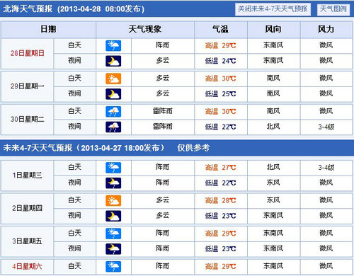 來自北海氣象局的預(yù)報(bào),28日,北海多云,有陣雨,東南風(fēng)2到3級(jí),氣溫24到29度;今晚到明天,多云,偏南風(fēng)3級(jí)。北部灣海面:未來兩天,東南風(fēng)4到5級(jí)。預(yù)計(jì)五一小長(zhǎng)假前半期晴熱,30日夜間有較強(qiáng)降雨和雷電、雷雨大風(fēng)天氣,5月1日陣雨轉(zhuǎn)多云,天氣涼爽舒適。