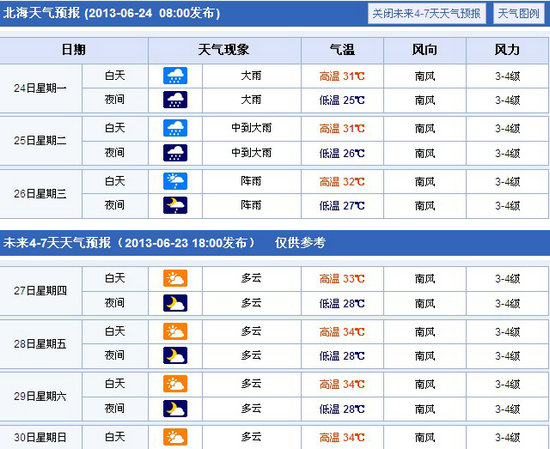 未來兩天我市受風(fēng)暴環(huán)流和西南季風(fēng)共同影響,北海市,有大雨,局部暴雨,南風(fēng)4到5級,氣溫26到31度,25日,大雨,偏南風(fēng)3到4級。北部灣海面,偏南風(fēng)6級陣風(fēng)8級,明天起,偏南風(fēng)5到6級。北海潿洲島航線今天已經(jīng)恢復(fù),游客朋友游玩時記得帶好雨具。
