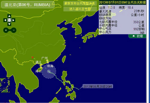中央氣象臺1日06時繼續(xù)發(fā)布臺風藍色預警:今年第6號熱帶風暴“溫比亞”的中心7月1日05時位于廣東電白東南方約560公里的南海中部海面上,就是北緯17.7度,東經(jīng)114.6度,中心附近最大風力有9級(23米/秒),中心最低氣壓為992百帕,7級風圈半徑350公里。