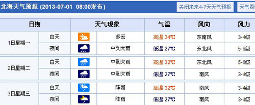 北海市氣象臺2013年07月01日08時51分發(fā)布臺風藍色預警信號:預計未來24小時內(nèi)受今年第6號熱帶風暴“溫比亞”的影響,北部灣海面及我市沿海將出現(xiàn)7級,陣風9到10級大風。