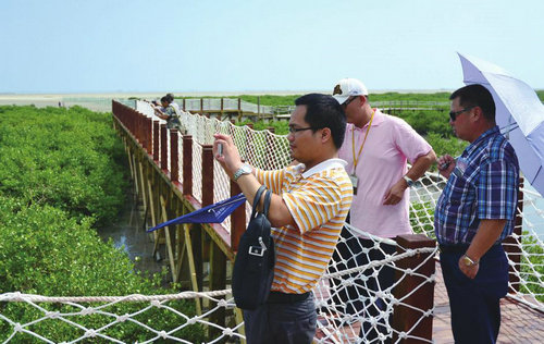 在金海灣紅樹(shù)林生態(tài)景區(qū),嘉賓們饒有興趣地參觀了紅樹(shù)林觀光帶、金灘和休閑娛樂(lè)區(qū),聽(tīng)講解員介紹景區(qū)里的濕地風(fēng)情和漁家文化?吹轿禐閴延^的大片紅樹(shù)林里不時(shí)飛起的白鷺,還有紅樹(shù)林下水中的魚(yú)、蝦、蟹等小生物,嘉賓們都忍不住拿出相機(jī)和手機(jī)拍照留念。