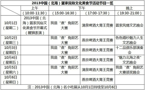 本屆中國(北海)疍家民俗文化美食節(jié)將于10月1日-10月6日在海灘公園舉辦,共計(jì)6天。其中,10月1日當(dāng)天上午10點(diǎn)將會(huì)舉行開幕式(醒獅表演),“2013中國(北海)名小吃展”也將會(huì)貫穿整個(gè)美食節(jié),將有北海著名小吃的代表性企業(yè)前來參展。而“我是‘煮’角廚藝大賽”則由北海美食愛好者與市民參賽,由北海餐飲界著名廚師(原富麗華行政總廚伍新偉、北海雄飛漁港行政總廚黃志平等人)擔(dān)任評委,比賽內(nèi)容包括現(xiàn)場美食創(chuàng)作和指定材料創(chuàng)作等,還會(huì)與游客進(jìn)行互動(dòng)。