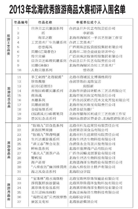 據(jù)報道,自今年9月份開始的2013北海旅游優(yōu)秀商品評選活動,經(jīng)過報名、登記、篩選、初評等評選環(huán)節(jié),截至11月6日,全市共有45家企業(yè)和個人120件商品參選,經(jīng)過專家初評,共有37件商品入圍。