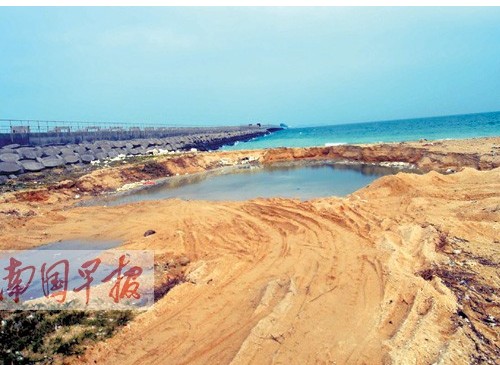 一位島民帶記者來到公山村小避風(fēng)港附近的海灘,眼前的一幕讓人心寒:原來美麗平坦的海灘已經(jīng)被盜砂者挖掘得到處是坑。
