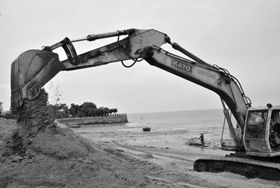 17日上午,記者在北岸廉州灣海灣新城區(qū)海域綜合一期工程施工現(xiàn)場看到,從海景半島廣場到北部灣一號的海灘已經(jīng)回填了不少海沙,原來低矮的海灘已經(jīng)被海沙回填得與灘肩持平,一輛挖掘機在海灘上挖掘沙子,推土機則往來推平回填了的沙子。