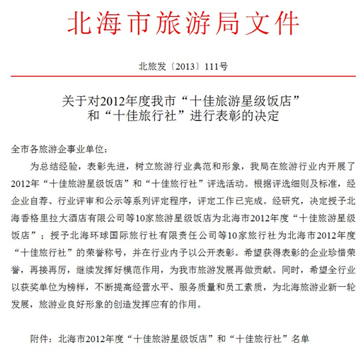 近日,北海旅游局發(fā)布通知,根據《關于開展北海市2012年度“十佳旅游星級飯店”和“十佳旅行社”評選活動的通知》(北旅發(fā)[2013]95號)精神,經對申報的旅游星級飯店和旅行社進行標準評定,入圍“十佳旅游星級飯店”和“十佳旅行社”的企業(yè)名單已產生,依照評定程序,現予以公示,公示期5天(從2013年12月19日至12月23日)。如對入圍企業(yè)有不同意見需反映,請在公示期內書面反饋至我局質管科(電話3032316,傳真3031960),逾期不再受理。