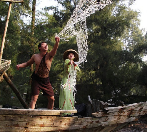在疍家婚禮巡演中,由“男方家”沿著指定路線前往“女方家”疍家棚,接著“坐艇”前往“拜堂”,期間有美妙的疍家民謠、咸水歌表演。在長廊門口的疍家迎賓女,身穿疍家服飾迎接嘉賓、游客等參觀疍家風情長廊并講解。最后是疍家女民兵巡演及歡樂體驗拉大網捕魚活動。