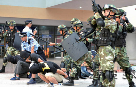 現(xiàn)場模擬在人流密集的火車站出站口,“6名恐怖分子”開兩輛越野車沖撞北;疖囌镜淖o欄,試圖沖進候車室碾壓旅客,由于護欄結(jié)實沒法撞開,“恐怖分子”下車后向旅客投擲爆炸物,多名“暴徒”持棍和刀斧突然從附近沖出,砍殺無辜旅客,造成旅客傷亡,車站進站口著火。由于火車站是市公安局部署的“一分鐘處置”重點區(qū)域,現(xiàn)場屬地分局武裝巡邏車組、武警徒步巡邏組和鐵路公安武裝突擊組僅用50秒鐘便到達中心現(xiàn)場,對其中6名“暴徒”進行果斷處置,分別將“歹徒”擊傷、擊斃、抓獲……