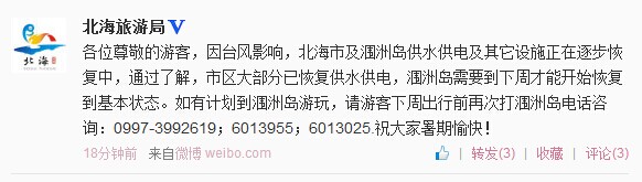 各位尊敬的游客,因臺(tái)風(fēng)影響,北海市及潿洲島供水供電及其它設(shè)施正在逐步恢復(fù)中,通過(guò)了解,市區(qū)大部分已恢復(fù)供水供電,潿洲島需要到下周才能開(kāi)始恢復(fù)到基本狀態(tài)。如有計(jì)劃到潿洲島游玩,請(qǐng)游客下周出行前再次打潿洲島電話咨詢:0779-3992619;6013955;6013025
