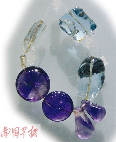 “三色水晶串珠”于1990年在合浦黃泥崗漢墓出土,串珠上有4顆漂亮的淺藍(lán)色晶體,琢成圓柱形,最小的一顆也有花生米大!爱(dāng)時(shí)的文物與考古學(xué)家都認(rèn)為這種淺藍(lán)色相當(dāng)少見(jiàn)”,合浦漢代文化博物館館長(zhǎng)廉世明說(shuō),這幾粒晶體最后被鑒定為“罕見(jiàn)的淺藍(lán)色水晶”。