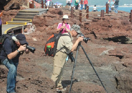 11月5日,秋日里的潿洲島天氣晴朗,綠樹環(huán)繞的島嶼更顯秀美壯麗。攝影家們不顧遠道的疲勞,他們被潿洲島的景觀深深吸引,在鱷魚山公園、五彩灘、天主教堂,大家紛紛舉起各自手中的“長槍短炮”,選取角度,認真構圖,記錄下這最美的瞬間。