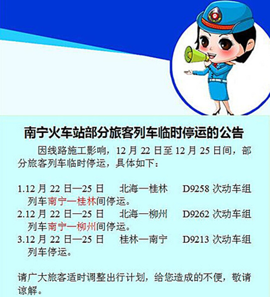 來(lái)自南寧火車站的通知:因線路施工影響,12月22日至12月25日間,南寧火車站部分動(dòng)車組列車臨時(shí)停運(yùn),請(qǐng)旅客朋友及時(shí)調(diào)整出行。
