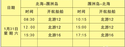 由于還沒風(fēng)浪相對減弱,船務(wù)公司今天下午宣布明天潿洲島復(fù)航,1月31日航班:北海-潿洲【0830北游12,1200北游12,1530北游16】;潿洲-北!1015北游12,1500北游12,1715北游16】;北海-?凇1800北1號】;?-北!1900北2號】。