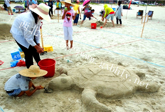 每年五一節(jié),銀灘都會舉辦沙雕大賽,今年已經(jīng)是第九屆了。今天上午,來自北海、欽州、南寧等城市的數(shù)百位選手又在銀灘公園開始了一場沙雕大賽,他們要在兩個半小時內(nèi)用沙子做出自己滿意的作品。今天上午太陽很大,選手們曬了一上午也是挺辛苦的。