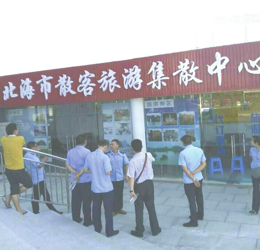 根據(jù)群眾舉報(bào),在北海高鐵站出站口左側(cè),有人擅自設(shè)立和懸掛醒目的“北海市散客旅游集散中心”的招牌在招攬旅游業(yè)務(wù)。接報(bào)后,市旅發(fā)委、市工商局執(zhí)法人員決定聯(lián)合執(zhí)法,于6月17日下午前往當(dāng)事地進(jìn)行核查取證。經(jīng)調(diào)查,該招牌為北海市鐵路旅行社所立,擅自使用“北海市散客旅游集散中心”的名稱,且無任何合法手續(xù),屬典型的違法違規(guī)行為,執(zhí)法人員當(dāng)場責(zé)令當(dāng)事旅行社務(wù)必在6月18日下午5時前完成拆除或整改。