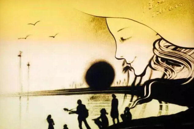 沙畫藝術(shù)是21世紀(jì)剛剛興起的一種與舞臺藝術(shù)相結(jié)合的表演形式,最早由來自匈牙利的世界著名沙畫大師弗蘭克•庫科所創(chuàng)造。它是指在白色背景板上現(xiàn)場用沙子作畫,并結(jié)合音樂通過投影展現(xiàn)在屏幕上。(via北海電視臺)