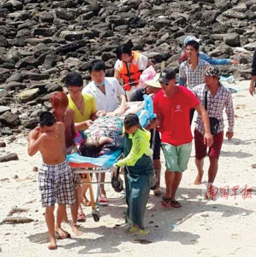 當(dāng)日上午11時許,駐島民警與潿洲島衛(wèi)生院醫(yī)務(wù)人員趕到現(xiàn)場,但因被礁石撞傷,加上溺水,兩人處于昏迷當(dāng)中!澳凶拥募绮亢投,受到撞擊出血,顱底骨折,女子的后腦勺也因受劇烈撞擊,有一道幾公分的傷口。經(jīng)過治療,男子已蘇醒,但情況未明顯好轉(zhuǎn),而女子傷勢較重?紤]潿洲島醫(yī)療條件有限,兩人被緊急送往北海市人民醫(yī)院搶救。