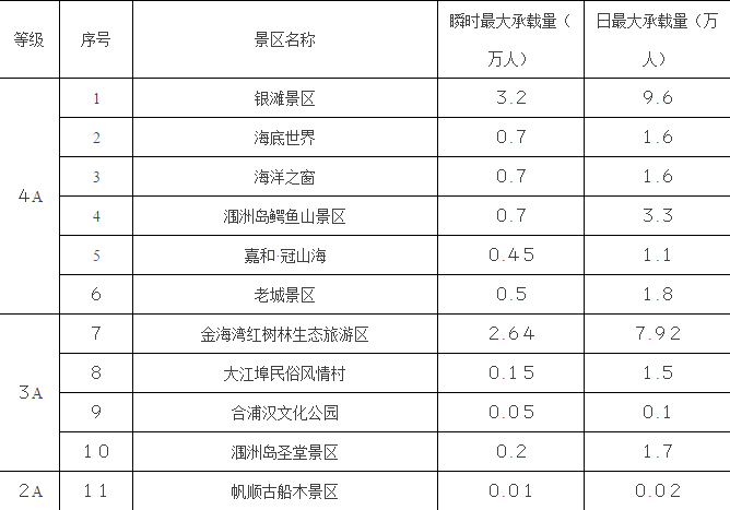 景區(qū)承載量分為“瞬時(shí)最大承載量”和“日最大承載量”兩類,如:銀灘景區(qū)瞬時(shí)最大承載量為3.2萬(wàn)人次,日最大承載量為9.6萬(wàn)人次;潿洲島鱷魚(yú)山景區(qū)瞬時(shí)最大承載量為0.7萬(wàn)人次,日承載量最大為3.3萬(wàn)人次。