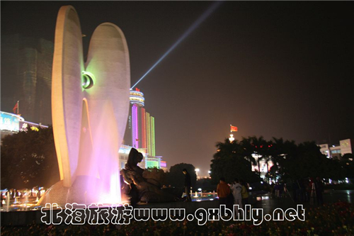 北部灣廣場(chǎng)川流不息的人群和車(chē)輛,那顆明珠和噴泉尤為出眾。