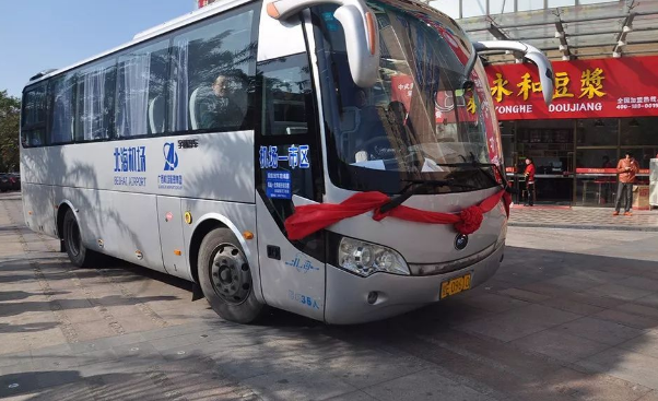 ▲機(jī)場(chǎng)大巴接送旅客往返于北海機(jī)場(chǎng)與候機(jī)樓之間。