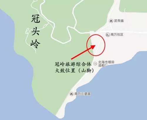 北海冠嶺旅游綜合體并不是建在山上的冠嶺山莊,它位于冠頭嶺山腳下,也就是現(xiàn)在登高冠頭嶺的進(jìn)山口南側(cè):