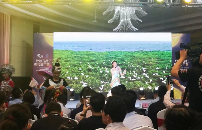 推介會(huì)上,不僅有身穿壯族傳統(tǒng)服裝的歌舞表演、自拍女王推介少數(shù)民族民俗,還通過PPT展示了廣西各大著名旅游景點(diǎn)、地標(biāo)建筑及廣西古老的文化積淀,重點(diǎn)對北海濱海度假旅游、桂林山水休閑度假游、長壽之鄉(xiāng)休閑養(yǎng)生游、少數(shù)民族風(fēng)情游、中越邊境探秘游等豐富多彩的旅游資源進(jìn)行了介紹。
