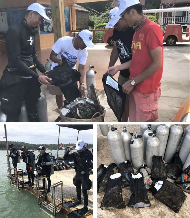 當(dāng)天下午,潿洲島探索潛水、小丑魚潛水、火山島潛水、深呼吸潛水等多家潛水公司還組織了潛水員,迎著西南浪,克服高溫、勞動(dòng)強(qiáng)度大等困難,對(duì)潿洲島附近海域海底廢棄漁網(wǎng)和海洋垃圾進(jìn)行清理,共清理海底垃圾24.3公斤。