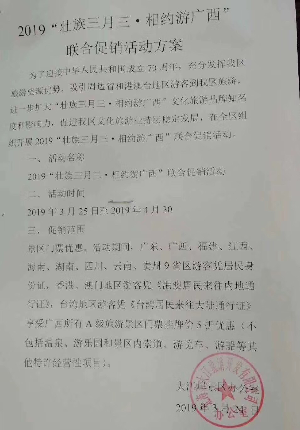 記者當(dāng)日獲悉,2019年3月25日至4月30日,廣西組織開展2019“壯族三月三·相約游廣西”聯(lián)合促銷活動(dòng)。廣東、廣西、福建、江西、海南、湖南、四川、云南、貴州9個(gè)省區(qū)游客憑本人居民身份證,香港、澳門地區(qū)游客憑《港澳居民來往內(nèi)地通行證》、臺(tái)灣地區(qū)游客憑《臺(tái)灣居民來往大陸通行證》享受廣西所有A級(jí)景區(qū)門票掛牌價(jià)5折優(yōu)惠(不包括溫泉、游樂園和景區(qū)內(nèi)索道、游覽車、游船等其他特許經(jīng)營(yíng)性項(xiàng)目)。
