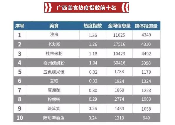 近日,新浪微輿情大數(shù)據平臺發(fā)布《2019年5月廣西旅游行業(yè)數(shù)據報告》在廣西美食熱度指數(shù)排行中北!鄙诚x“超越“老友粉”和“桂林米粉”躍居5月份排行榜之首!該榜單顯示沙蟲熱度指數(shù)為1.36全網信息量為11025,媒體報道量為4349均高于其他美食.