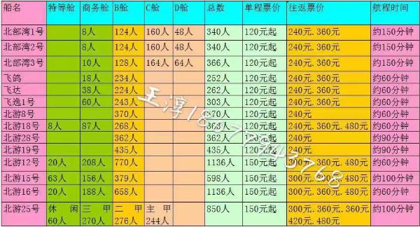 飛達,飛逸1號,北游18:A等艙(位于二樓)180元/人,B等艙(位于一樓)120/人,特等艙240元/人