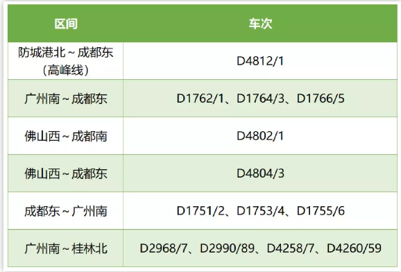 借助新線運(yùn)能釋放,新圖經(jīng)由貴廣客專廣西境內(nèi)的動(dòng)車組新增13對(duì),其中開(kāi)往成都方向的動(dòng)車組9對(duì),利用跨局套跑動(dòng)車組在桂林至廣州兩地間新增D2968/2967、D2990/2989、D4258/4257、D4260/42594對(duì)動(dòng)車組列車。亮點(diǎn)二:調(diào)整運(yùn)行區(qū)段9對(duì),