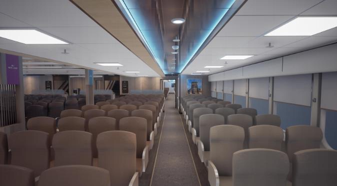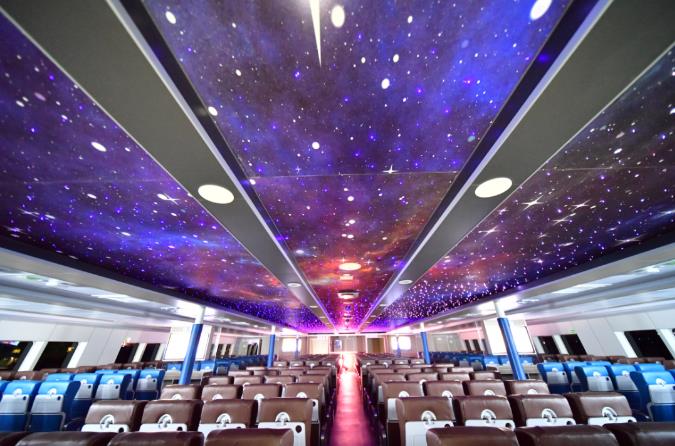 駕駛甲板設(shè)VIP間3個(gè)(24人),會(huì)議室1間,二層甲板設(shè)貴賓艙132人,商務(wù)艙294人,VIP間和貴賓艙配置按摩真皮座椅,主甲板設(shè)經(jīng)濟(jì)艙750人。
