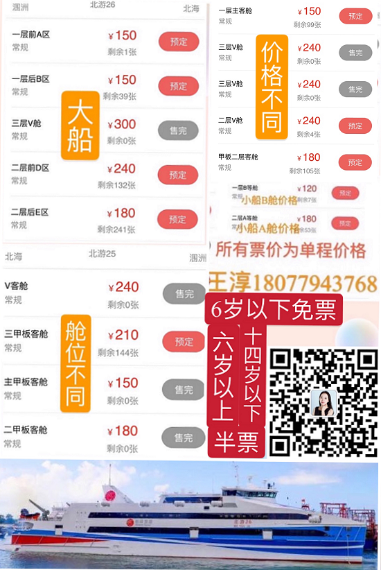 明天去潿洲島還能買到船票嗎?經(jīng)常有客人這樣問我,其實去潿洲的船票,就好比動車票一樣,售票是動態(tài)的,不能完全確定說有或者是沒有,如果你到碼頭,剛好遇到有其他游客退票,哪么你就可以有票,相反,就不一定有票,象旺季,有時候都是提前一個月開始定票,哪么等你到了北海就沒有船票了,象臺風(fēng)天或天氣不穩(wěn)定有變化的時候,船票也是提前就賣完了,所以不管你是什么時候去潿洲島,都是需要提前買好船票,這樣才可以安心旅游,北海環(huán)球國際旅行社提供代定船票,按實際票結(jié)算,不收取任何服務(wù)費用(旺季不單定船票業(yè)務(wù),敬請理解)朋友訂票直接掃碼加微信,早定早安心。