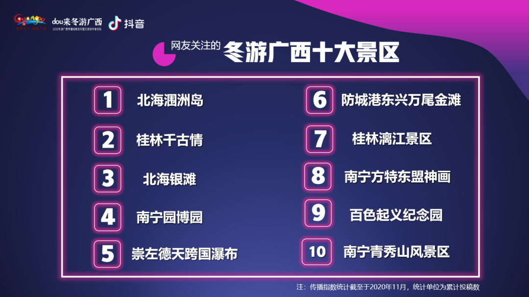 11月19日,“dou來冬游廣西——2020冬游廣西傳播指數(shù)發(fā)布暨文旅創(chuàng)作者論壇”在南寧舉行。發(fā)布會針對2020冬游廣西傳播指數(shù)進(jìn)行了解讀,結(jié)合2020冬游廣西“C位”關(guān)鍵詞,生動展現(xiàn)了“廣西文旅”的抖音畫像,也為游客提供了更加精準(zhǔn)的冬游廣西向?qū)А?br />