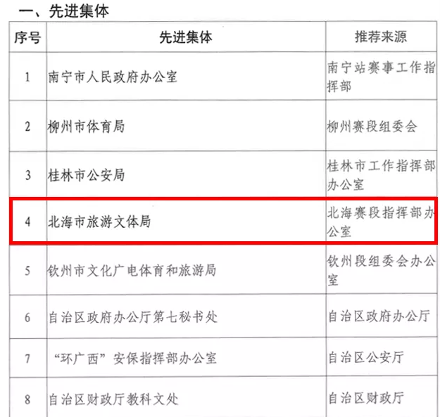 北海市旅游文體局獲“環(huán)廣西”世巡賽組織籌辦工作“先進(jìn)集體”表彰