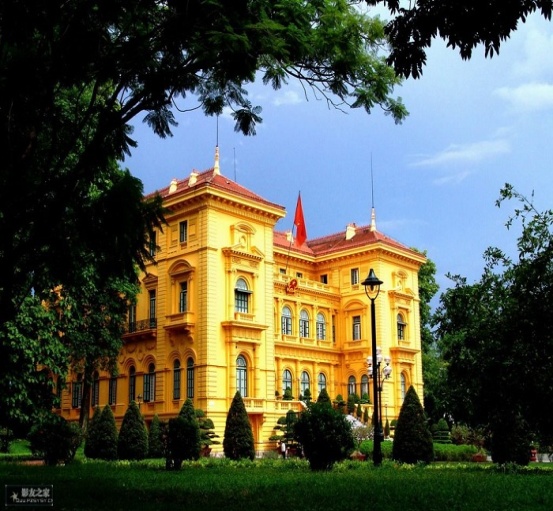外觀主席府:主席府是一橦極漂亮的法國式建筑,在法屬期間, 曾是法駐印度支那總督居住和辦公的地方;