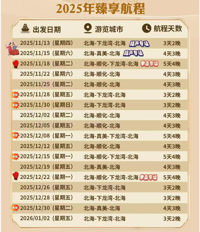 5、以上行程的靠岸及離岸時間均為參考時間,根據(jù)實際情況可能會有所改動,具體以通知書為準(zhǔn),請務(wù)必留意日報最晚回船時間,合理安排岸上游覽行程,以免錯過登船。