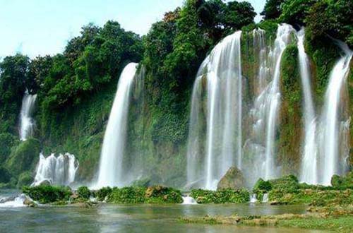 越南板約瀑布位于廣西邊陲大新縣、中越邊境交界處歸春河上游越南一方。與緊鄰的德天瀑布相連,堪稱世界第二大跨國(guó)瀑布,僅次于美國(guó)和加拿大邊境的尼亞加拉大瀑布。瀑布上游河水時(shí)急時(shí)緩,時(shí)分時(shí)合,迂回曲折,于參天古木之間、花草掩映之下,百鳥(niǎo)鳴徊。忽遇斷崖、飛瀉而下,恰似一巨大銀練高懸于谷峽之上。站在瀑布下,水氣蒸騰,上接云漢,滾滾洪流,濤聲回蕩于山谷,聲若巨雷數(shù)里可聞。若遇晴日,彩虹飛渡,其魄力、其風(fēng)采、其氣勢(shì)震魂攝魄,搖動(dòng)心旌。