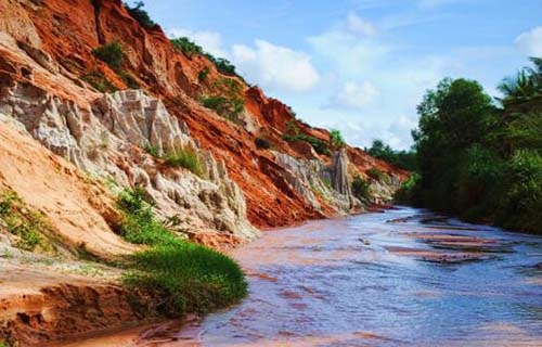 仙女溪是流經(jīng)美奈東側(cè)沙丘和巖層的一條小溪,掩藏在濃密的樹林里。仙女溪的紅土大陸映襯在藍(lán)天白云之間,腳下是細(xì)軟的紅色沙泥,以及只漫過腳踝的淺淺溪水。當(dāng)?shù)堑郊t土的最高處,小小的美奈便盡收眼底,掩映在青山綠樹與遼闊的大海之間,嗅不到任何過度商業(yè)化的氣息。在仙女溪游玩是要赤腳淌水逆行,所以穿短褲或短裙以及拖鞋是最方便的。水很淺,沙細(xì)細(xì)的,經(jīng)過烈日的暴曬,水溫有點暖暖的,赤腳涉水而行,腳踩在細(xì)細(xì)的沙面上,細(xì)沙和著暖暖的水,流溜過你的腳趾縫,那種感覺就像仙女用她那纖纖細(xì)長的手指在替你足浴。這個景點,其實就像是我國云南元謀土林一個微型盆景,屬于典型的紅沙黏土地帶流水地貌。山腰上的小泉水流出來,帶著土林地表的紅沙黏土流到谷底,慢慢的,溪水被染成了紅色,也稱:紅溪。沿著這紅色溪水流淌的精致小峽谷,大約游覽步行20分鐘再折回,也就游完了整個景點。