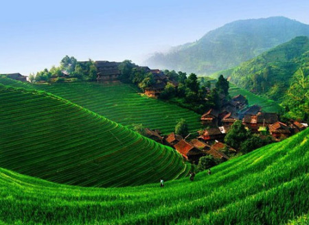 龍脊梯田距龍勝縣城27公里,距桂林市80公里,景區(qū)面積共66平方公里,梯田分布在海拔300至1100米之間,坡度大多在26至35度之間,最大坡度達50度。雖然南國山區(qū)處處有梯田,可是象龍脊梯田這樣規(guī)模的實屬罕見。龍脊梯田始建于元朝,完工于清初,距今已有650多年歷史。龍脊開山造田的祖先們當初沒有想到,他們用血汗和生命開出來的梯田,竟變成了如此嫵媚瀟灑的曲線世界。在漫長的歲月中,人們在大自然中求生存的堅強意志,在認識自然和建設家園中所表現(xiàn)的智慧和力量,在這里被充分地體現(xiàn)出來。